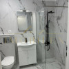 baie cu gresie și faianță tip marmură, duș walk-in și wc încastrat